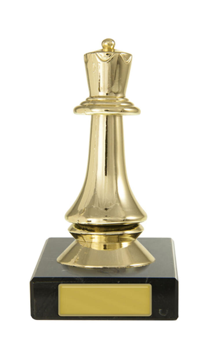 Crafted for distinction, this chess trophy features a refined gold queen figure set atop a substantial marble base. The sophisticated design, offers a memorable way to celebrate chess achievement.