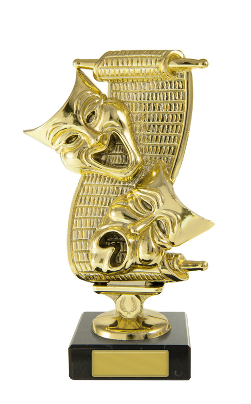 Celebrate outstanding theatrical artistry with this drama award trophy, crafted to recognise performance and dedication in the dramatic arts. Featuring classic gold comedy and tragedy masks set on a solid black round base, it balances tradition with lasting quality.