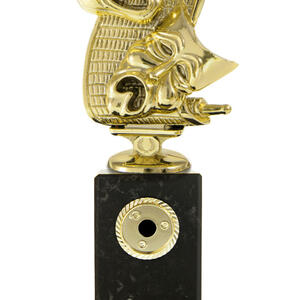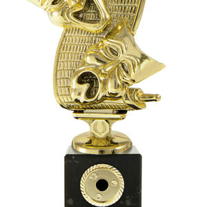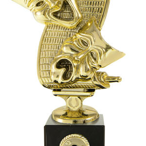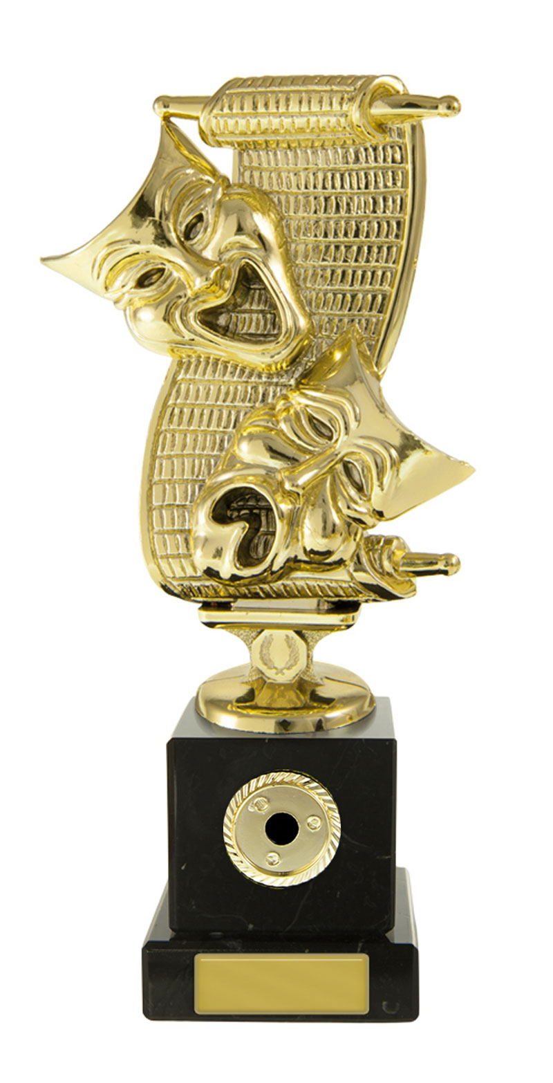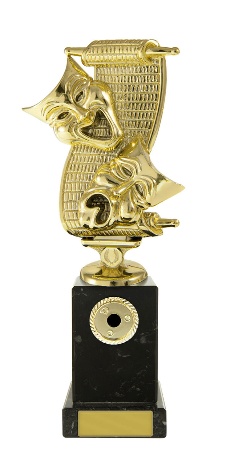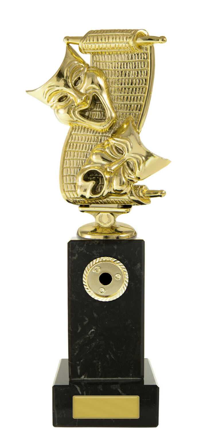Celebrate dramatic achievement with this distinguished drama trophy, crafted to recognise outstanding contributions to the performing arts. Featuring a sculpted face with classic comedy and tragedy masks on a scroll, it stands atop a solid black base accented by a gold plate.