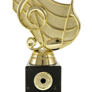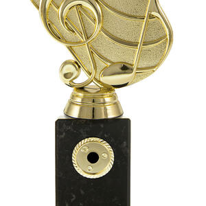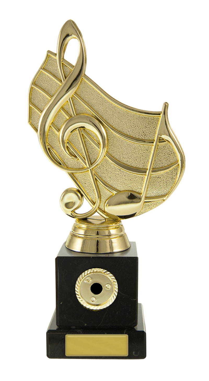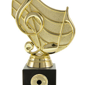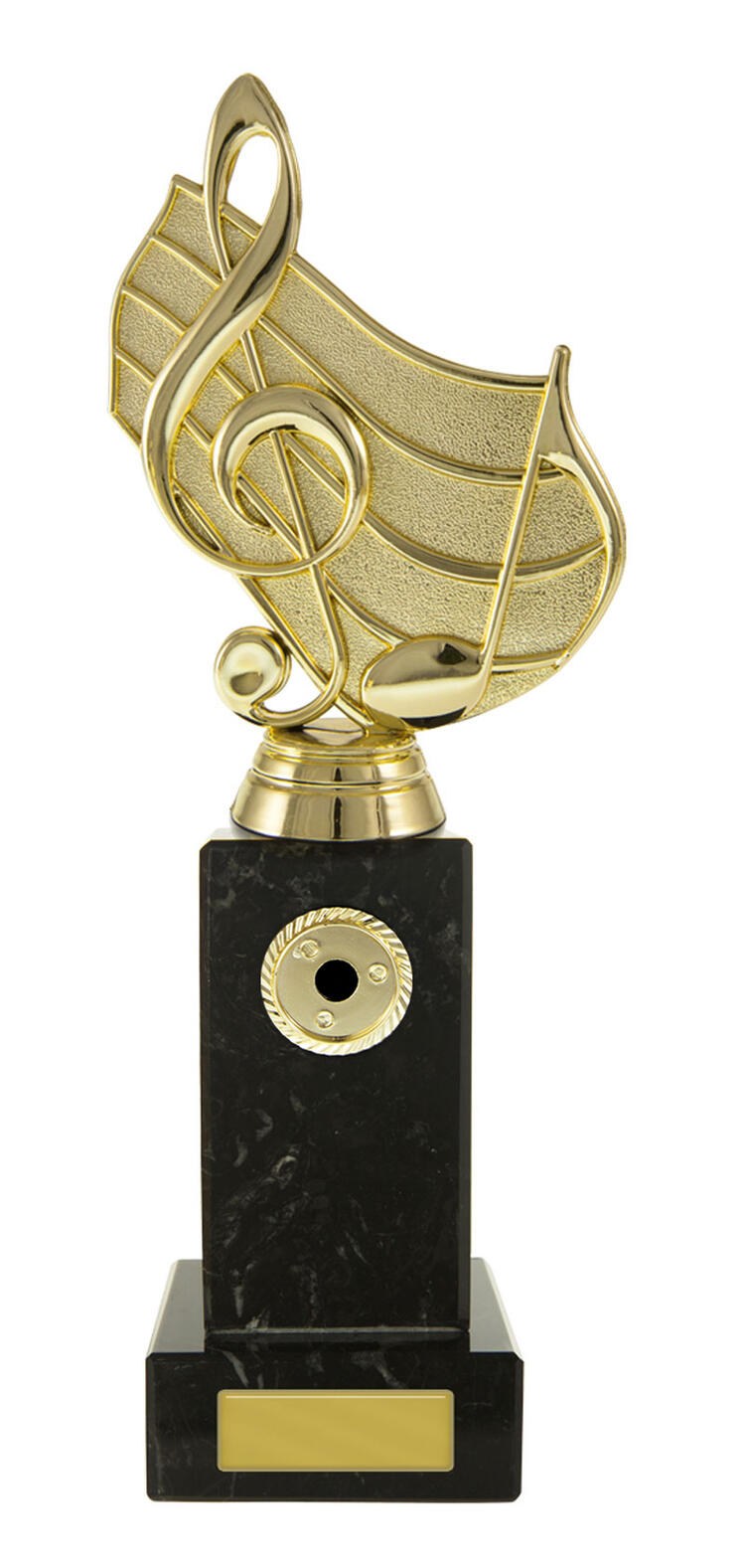 This music award trophy features a gleaming gold treble clef and musical notes set against a background, elegantly showcased on a substantial black base. The award combines quality materials for a durable, professional finish.
