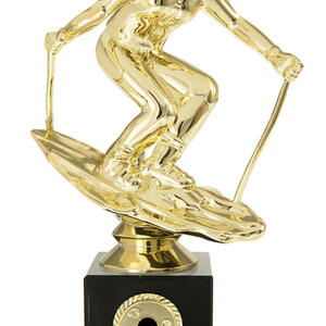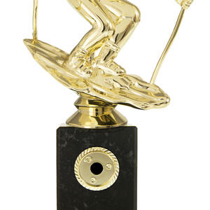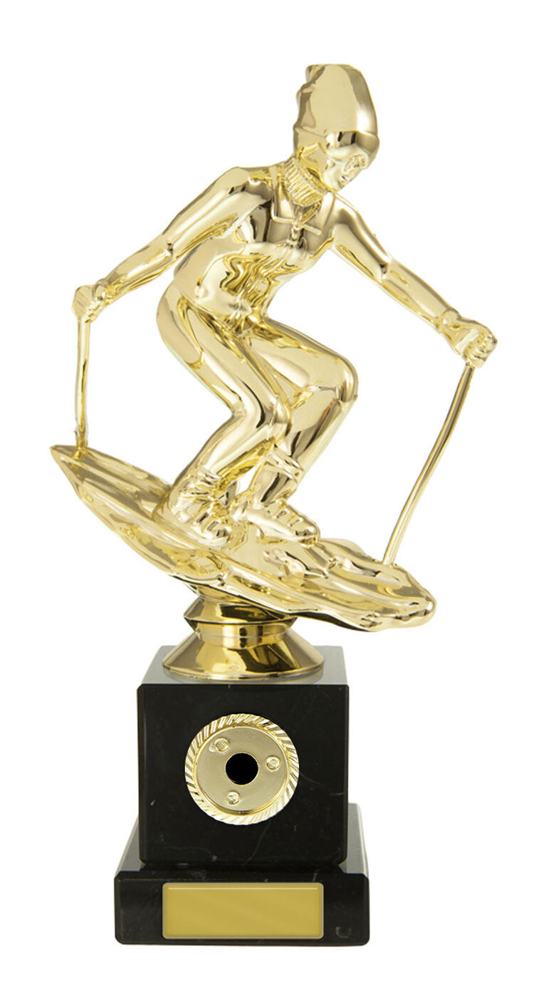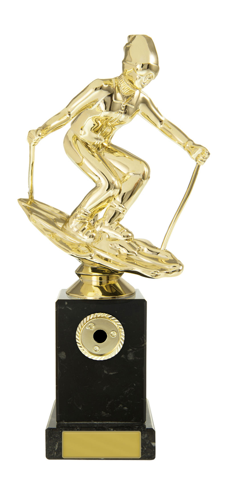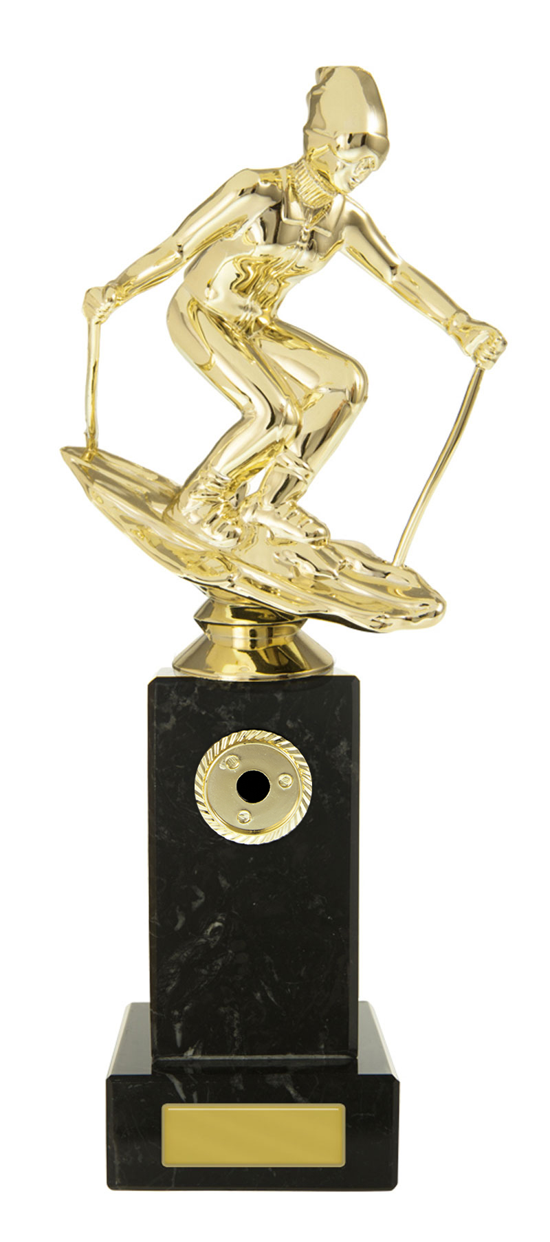 A striking option for recognising skiing excellence, this skiing trophy presents a gold toned skier figurine poised on a black base. The trophy's refined design incorporates a centre holder and a sleek rectangular plaque for personalisation, making it a memorable choice for sports clubs and community events.