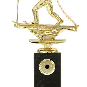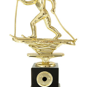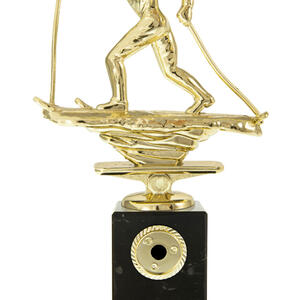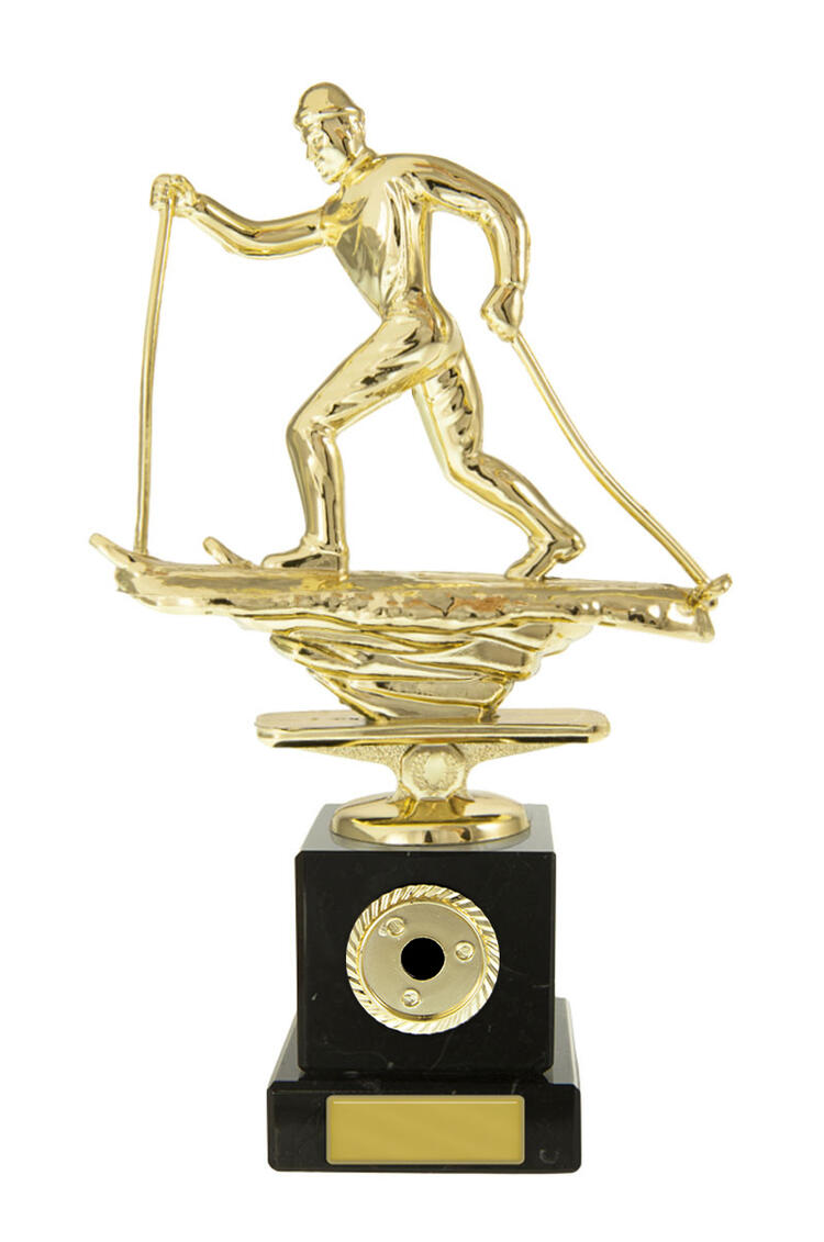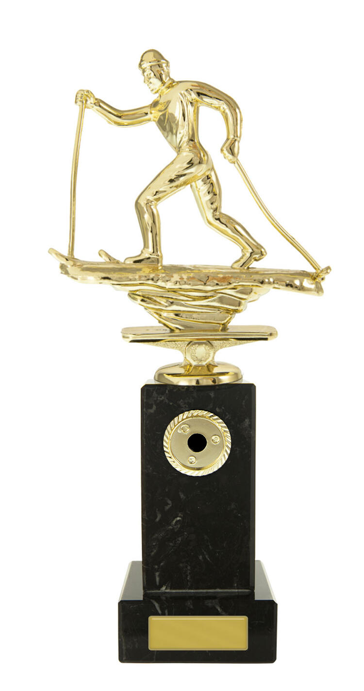This skiing trophy features a gold skier in dynamic motion, mounted atop a solid black base. The classic rectangular base and premium materials highlight a commitment to quality and precision. Finished with a gold plaque for custom personalisation, it is an elegant choice for recognising achievement in skiing and celebrating winter sports excellence.