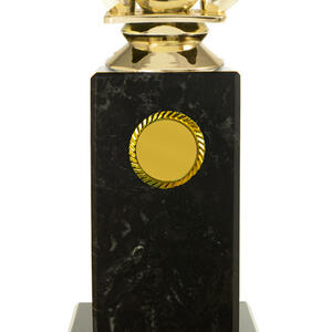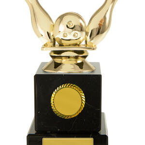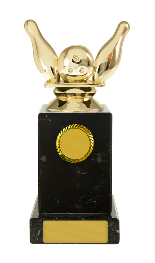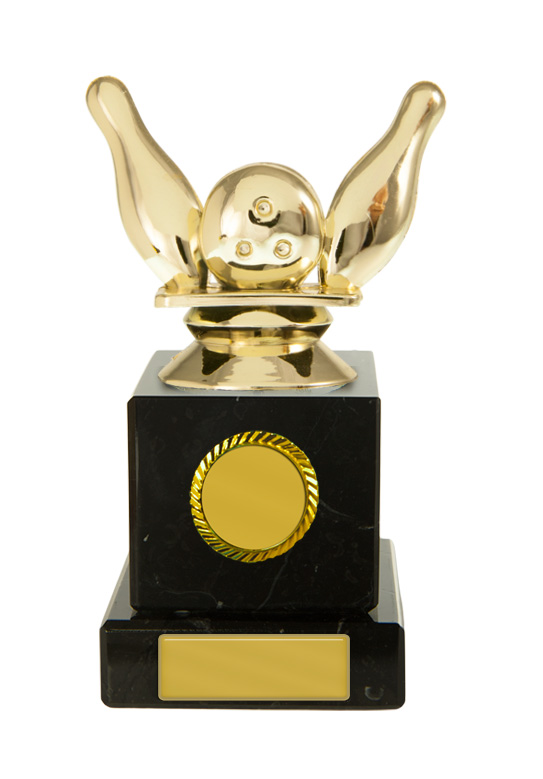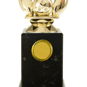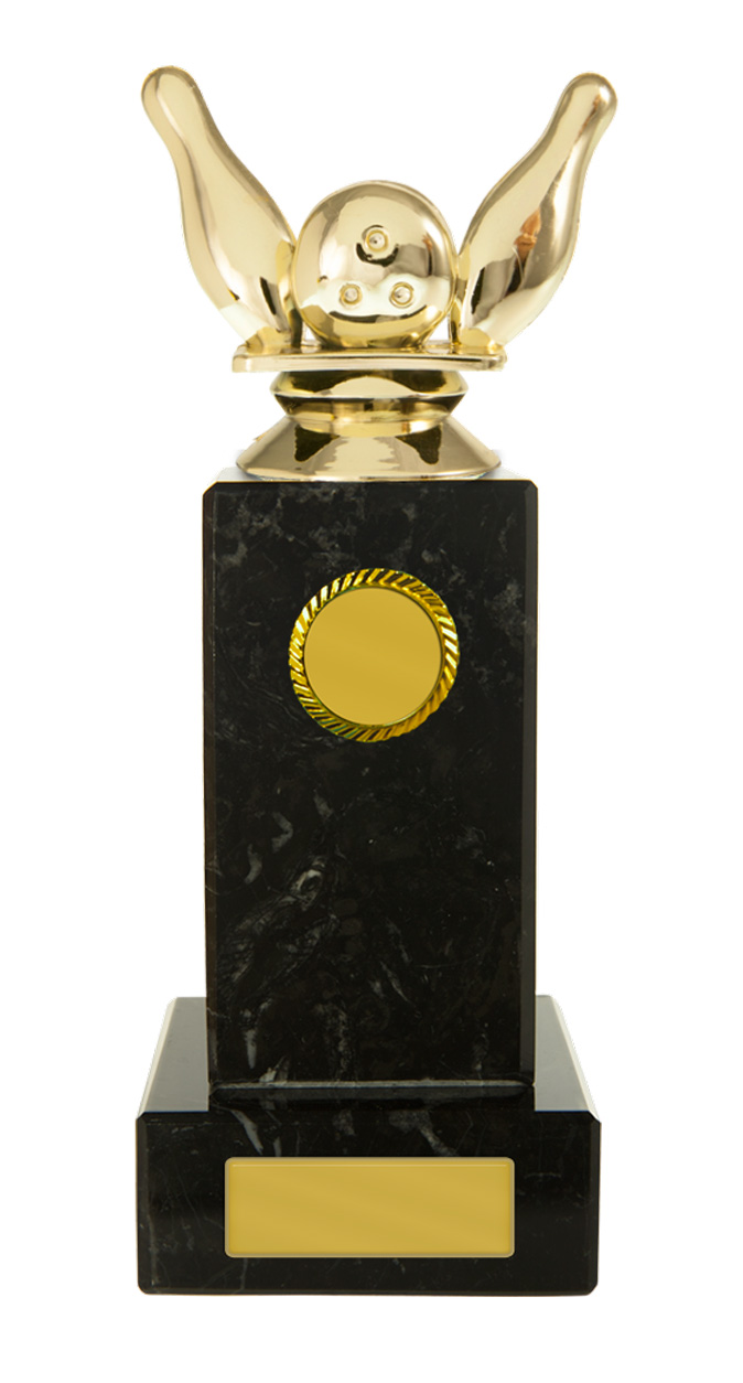Crafted for distinction, this tenpin bowling trophy stands out with its dynamic golden bowling ball and pins figure set atop a polished black base. Gold star accents and a sculpted action pose capture the spirit of tenpin bowling awards, creating a memorable tribute.