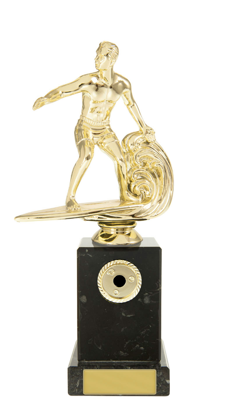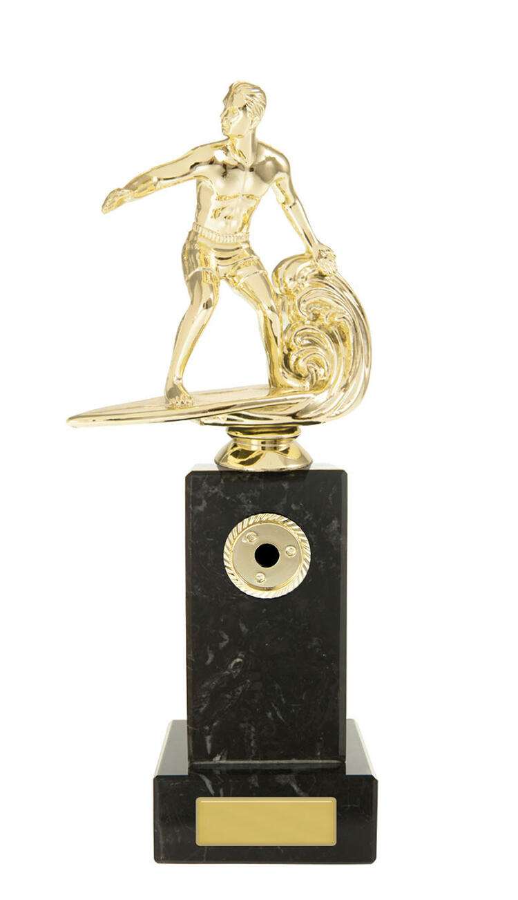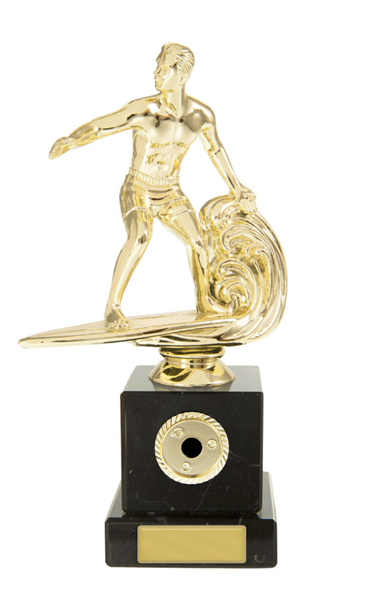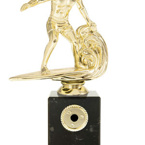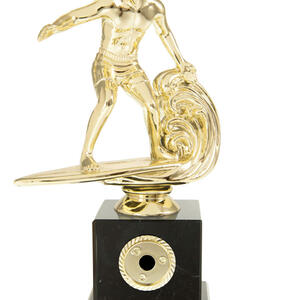 Blue Acrylic Wave with Mirror Silver Surfing Figure on Silver Metal Base
