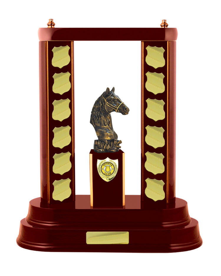 This timber trophy is a distinguished perpetual trophy designed for all sporting achievement. Featuring an interchangable figure, it stands on a solid black wood base. Multiple gold plates offer lasting recognition.