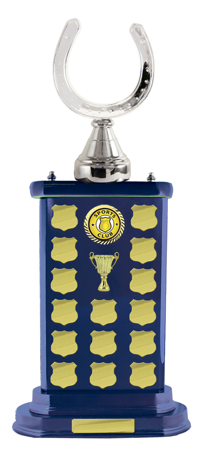 This timber perpetual trophy is designed for any sporting recognition, featuring a interchangable figure set on a rectangular timber base. The blue, silver, and gold colour scheme offers visual sophistication, while multiple gold plates allow for ongoing recognition.