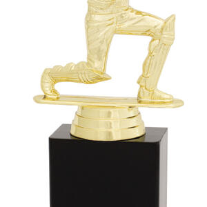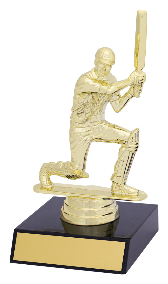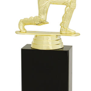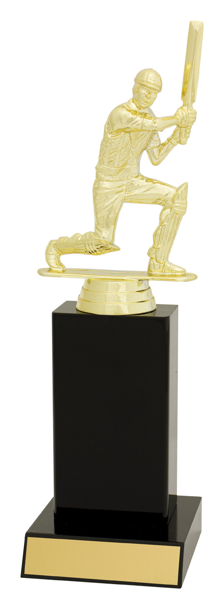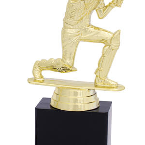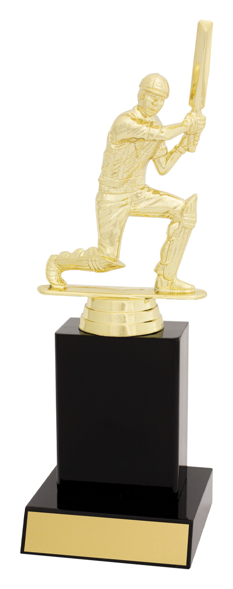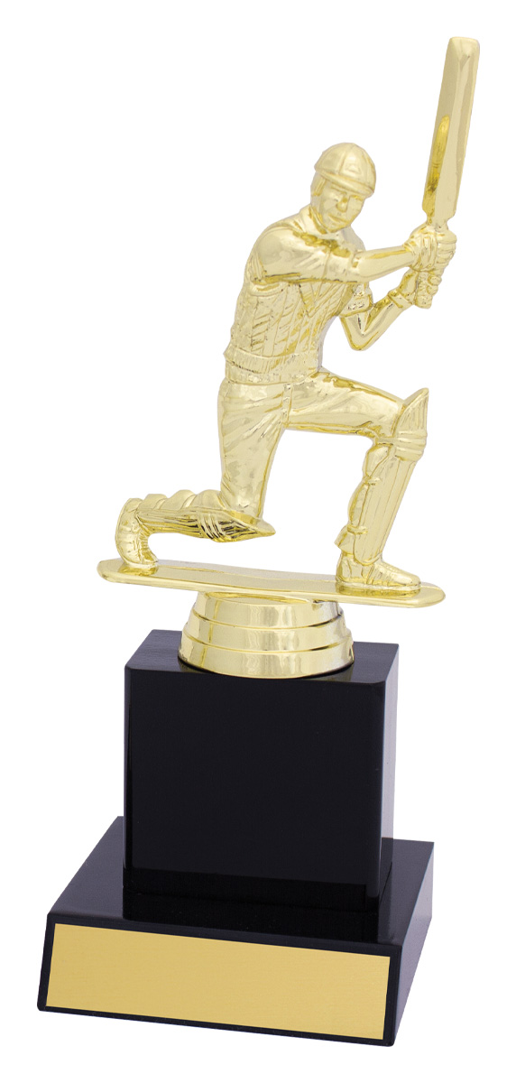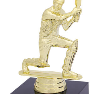This trophy presents a striking representation of cricket achievement, featuring a gold coloured plastic batsman poised for action atop a sleek, gloss black timber base. The rectangular base adds stability and contrast, highlighting the elegant form of the figurine. A gold plaque on the base completes the professional look, making it an ideal choice for cricket trophies that celebrate memorable sporting moments.