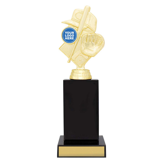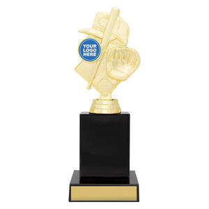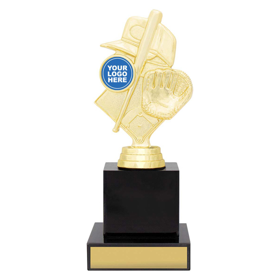Gold trophy featuring bat, glove, ball, and helmet design on a black marble base. Includes space for a custom logo insert and gold engraving plate. Ideal for personalised club recognition.