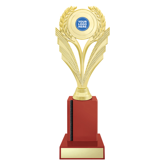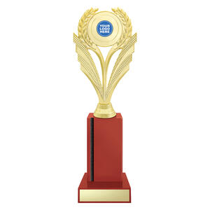 Featuring a refined gold laurel plastic top and taller red timber base, this trophy offers timeless appeal. Designed to hold your logo or sport insert and an engraved message plate.