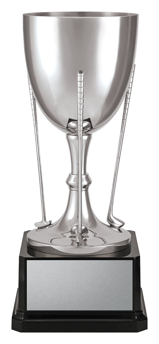 This elegant trophy showcases a refined combination of silver and black, with a classic cup design set atop a sturdy base. Crafted from quality metal and plastic, it features intricately detailed golf clubs and a golf ball, making it a distinguished choice for golf trophies. Its thoughtful construction celebrates achievement in golf with lasting style and presence.