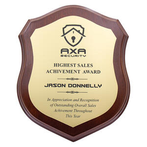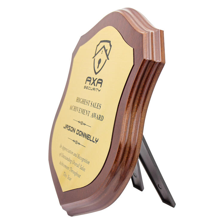This elegant shield plaque features a gold laser engraved plate mounted on a timber backing, creating a classic and professional finish. The plaque includes a sturdy plastic stand at the back for convenient display on desks, shelves, or cabinets. A timeless choice for recognising excellence, achievement, or service across corporate, academic, and club presentations.