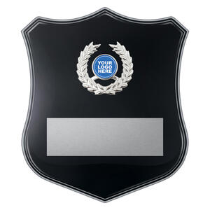 This award shield plaque features a polished finish with a silver plastic wreath centre designed to hold a 25mm custom logo insert. The plaque includes a silver engraving plate for personalised text, making it an ideal choice for recognising achievement, service, or special events. A classic design that offers both elegance and versatility for any presentation.