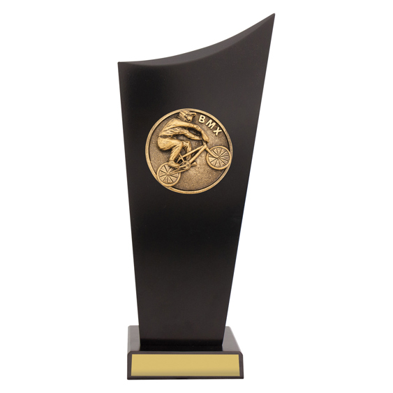 Silver and gold resin BMX trophy featuring a large circular rider image framed by laurel leaves and stars. A strong, bold award for BMX champions and competition presentations.