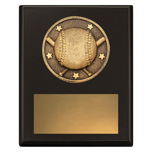 Contemporary black plaque featuring a round antique gold baseball emblem with crossed bats and star detail. Professional finish ideal for club presentations, end of season awards, or recognition gifts.