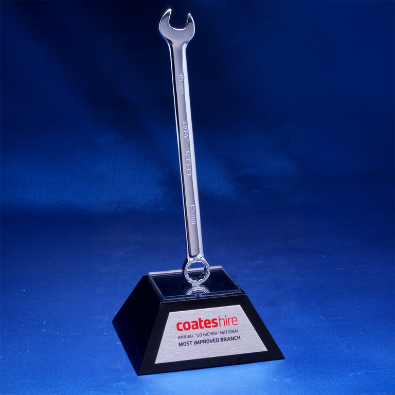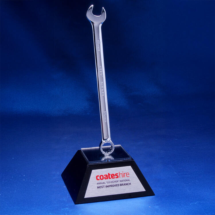 A striking custom award featuring a polished chrome spanner mounted upright on a sleek black pyramid base with brushed metal title plate.
