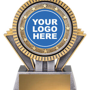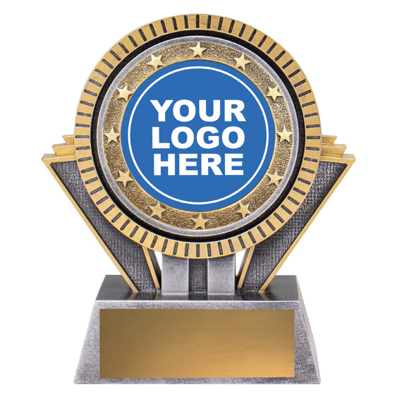 This dynamic starburst resin trophy blends silver and gold finishes, creating a bold visual statement. Includes a circular centre for your custom logo or standard sport image.
