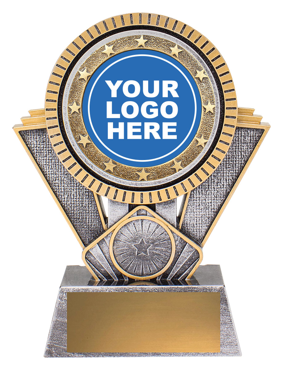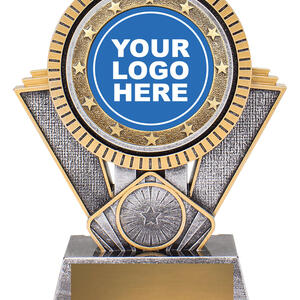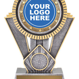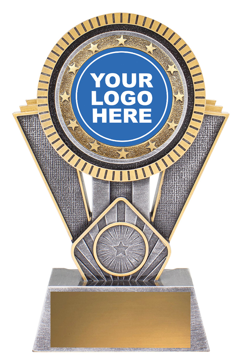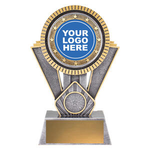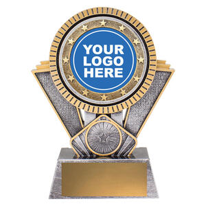 This dynamic starburst resin trophy blends silver and gold finishes, creating a bold visual statement. Includes a circular centre for your custom logo or standard sport image.