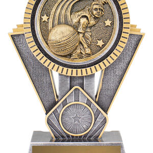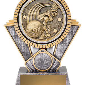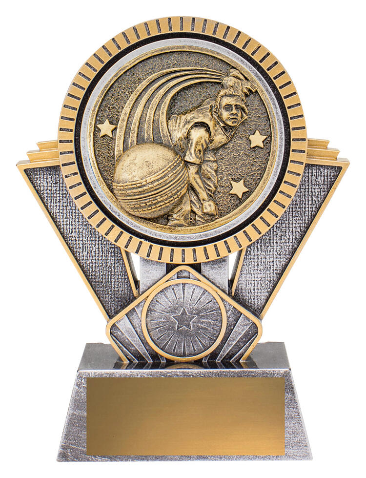 This cricket trophy celebrates skill and achievement with a striking bowler and ball motif, framed by star accents for added distinction. The trophy features a classic circular emblem and rests on a sturdy rectangular base, crafted in elegant gold and silver finishes. A standout choice among cricket trophies, it offers a memorable way to honour outstanding performance on the field.