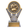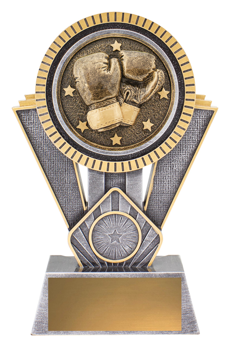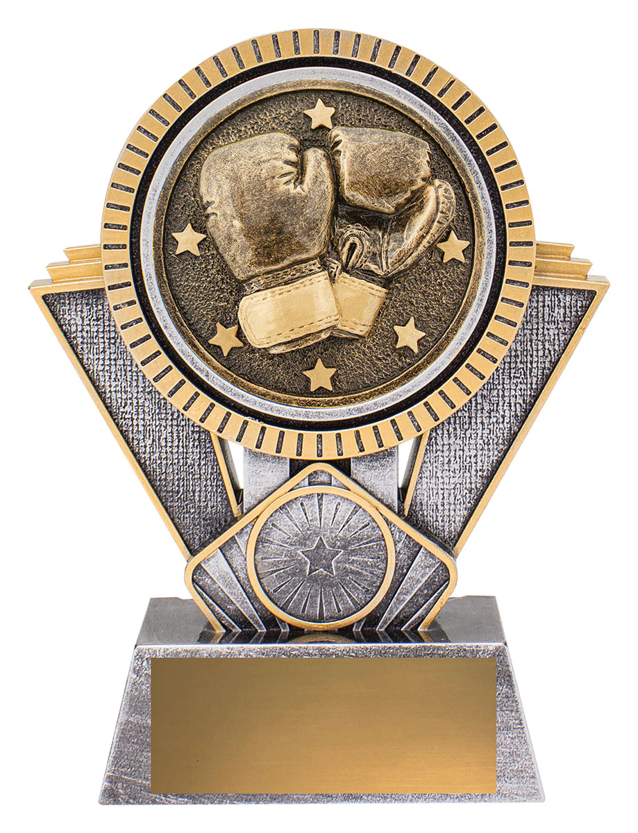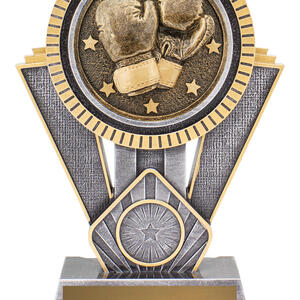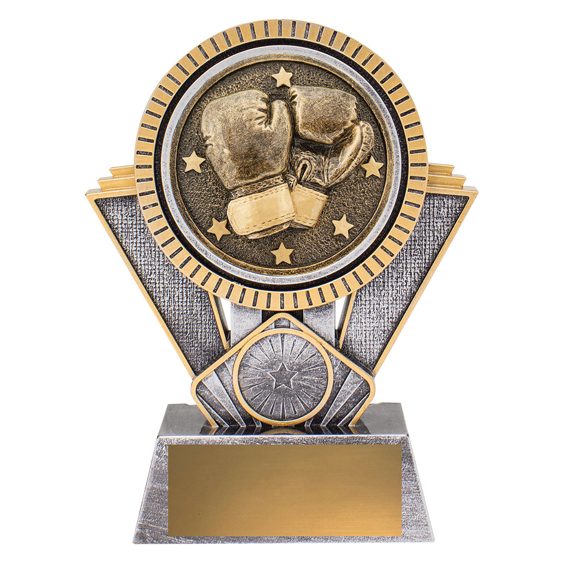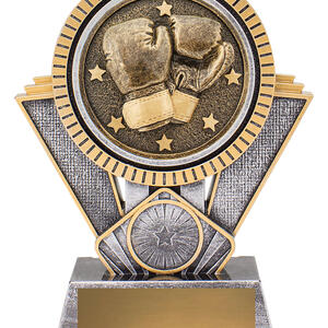 Compact boxing trophy featuring a circular gold and bronze boxing glove emblem on a modern tiered base. This eye catching design suits all levels of boxing achievement from junior awards to professional events.
