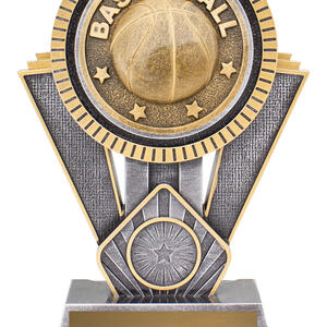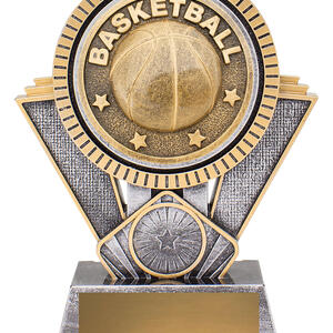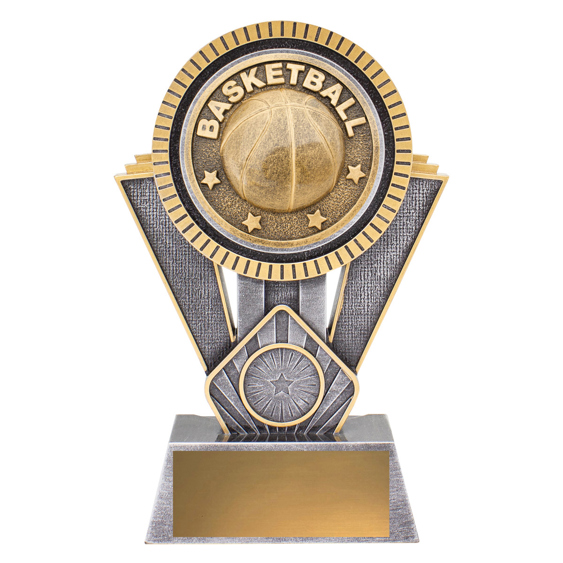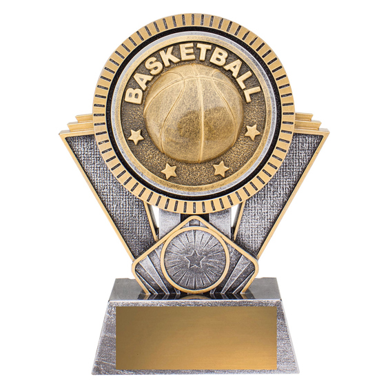 A stylish antique gold and silver resin basketball trophy featuring a detailed ball and hoop emblem framed by bold geometric lines. Its sturdy design and premium finish make it suitable for all levels of competition, from junior leagues to senior championships. Includes a gold engraving plate for personalisation.