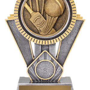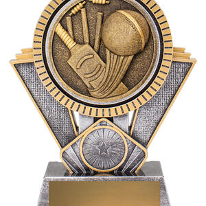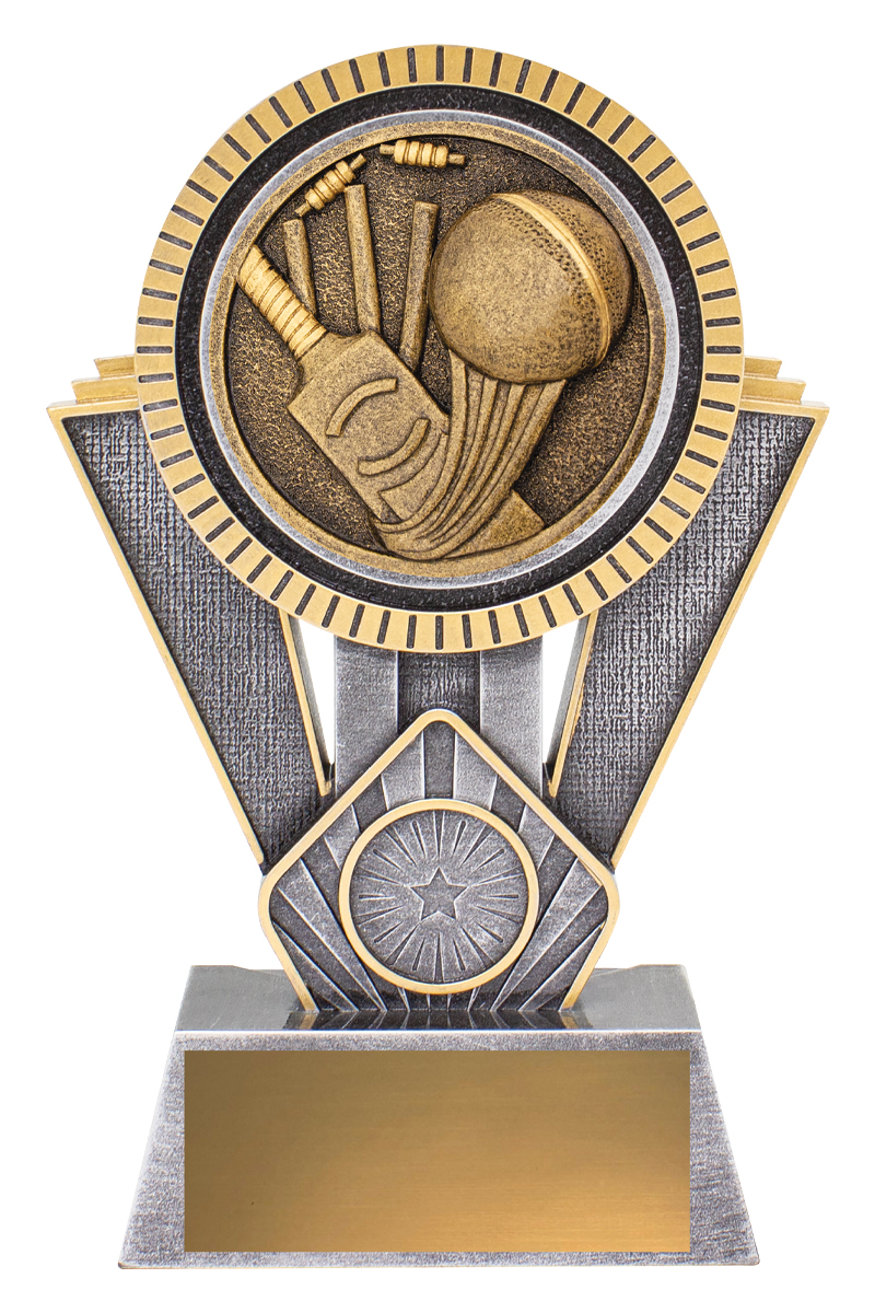 Honouring cricket excellence, this trophy features a distinctive circular emblem framed by a rectangular base, crafted from a resin for lasting quality. The design incorporates a bat, ball, and stumps, celebrating the spirit of the game. Available in a gold finsih, it stands as a memorable addition to any cricket trophies presentation.