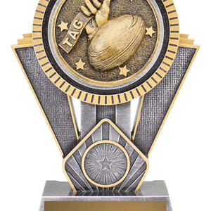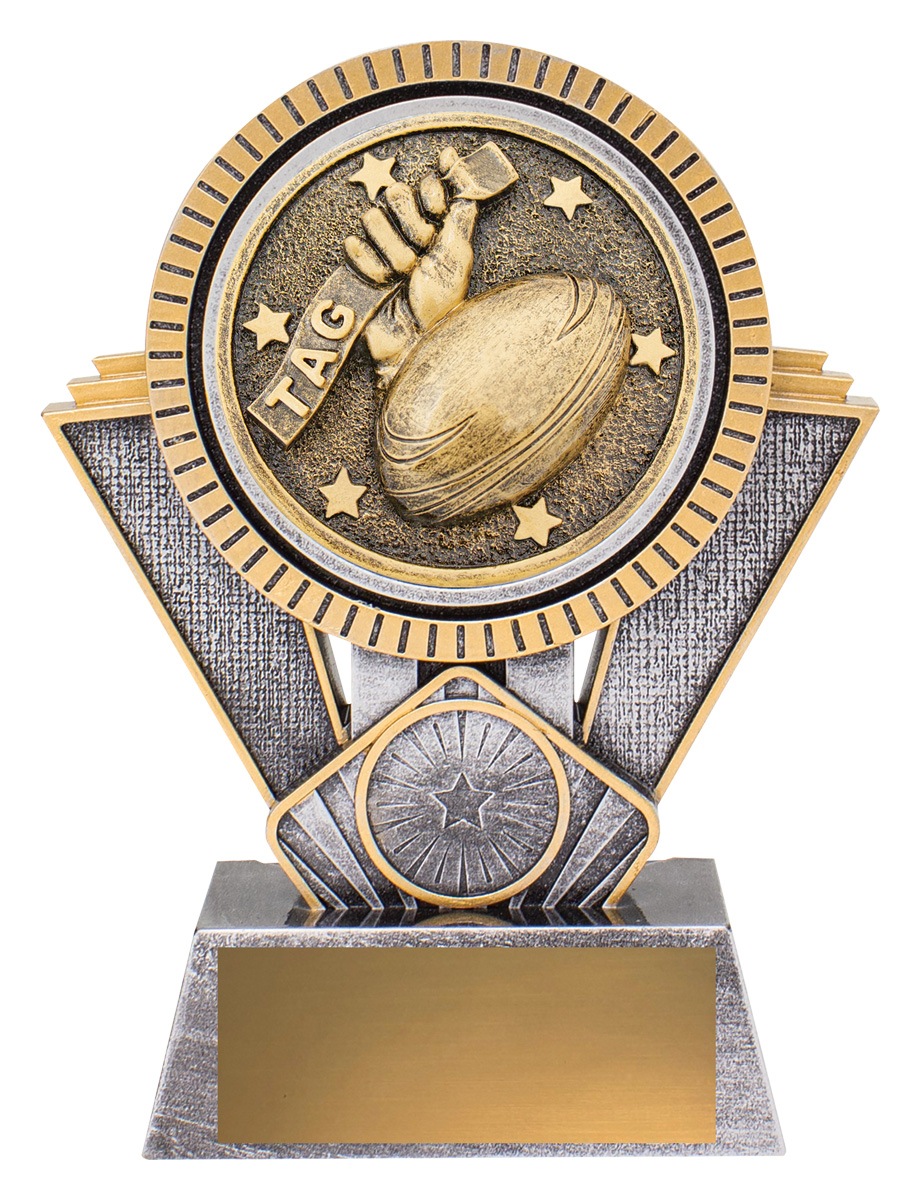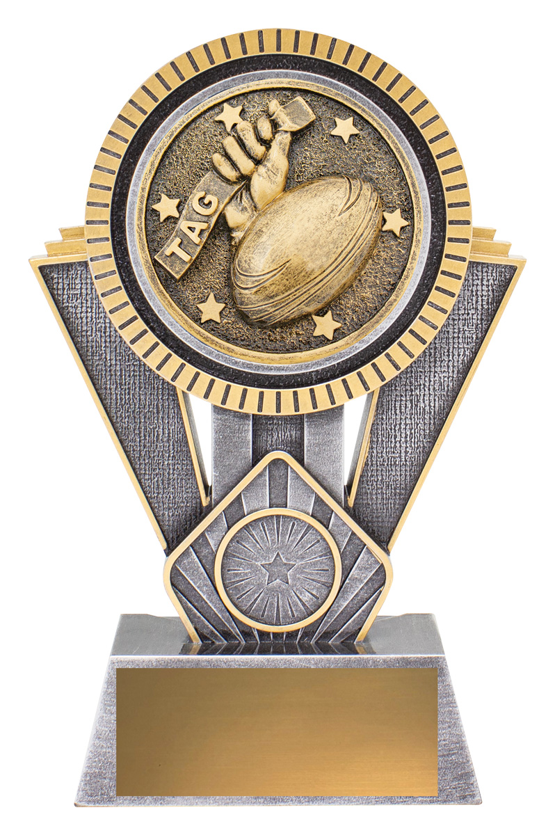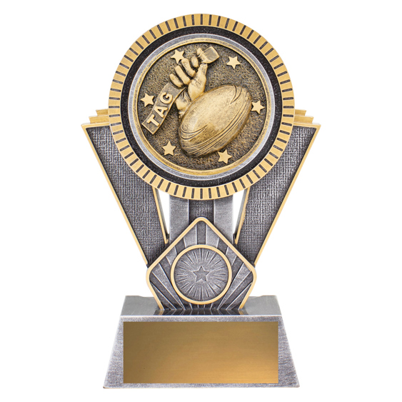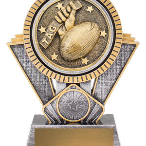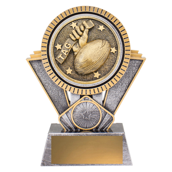 This touch football trophy highlights a detailed hand and ball motif framed by gold and silver elements. A great choice for end of season awards or touch football competitions. Engraving plate included.