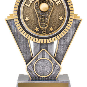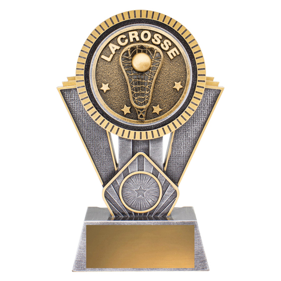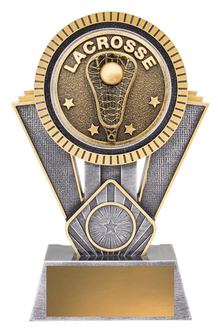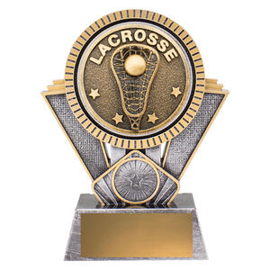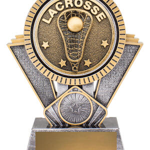 A bold lacrosse trophy featuring a stick and ball within a circular frame. Crafted from quality resin with antique metallic finish, itÂ’s ideal for lacrosse clubs and tournament presentations.