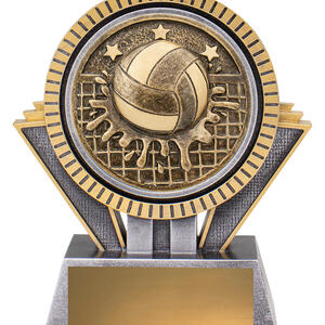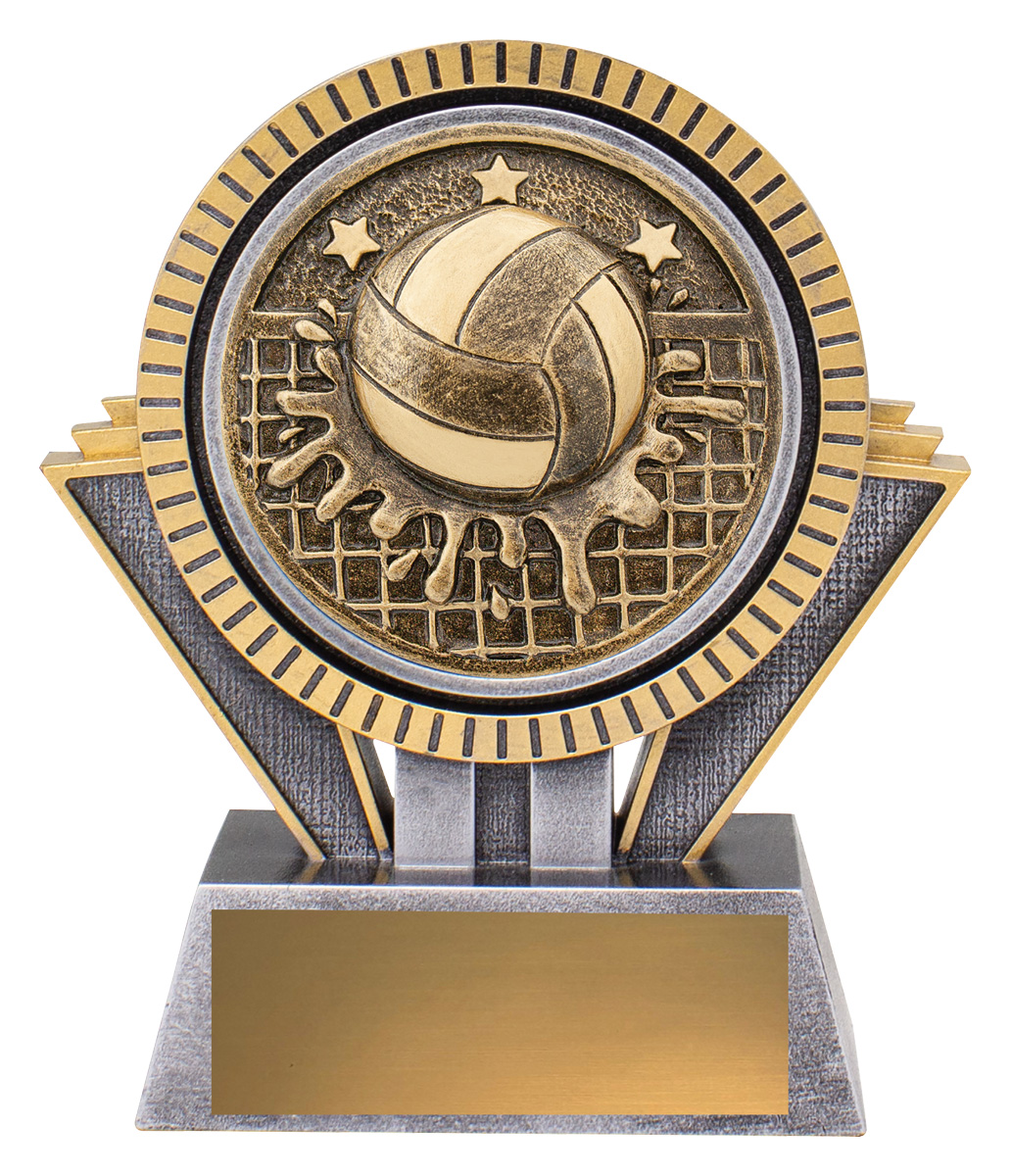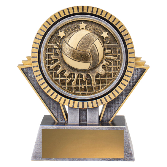 This volleyball trophy captures a 3D ball and net design framed by a circular gold and silver motif. A striking choice for beach or indoor volleyball competitions and club awards.