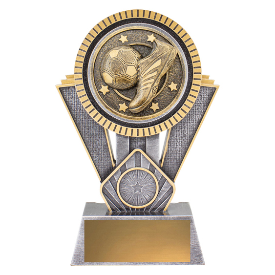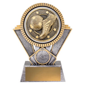This soccer trophy presents a detailed boot and ball set in a circular frame. A popular award choice for football teams and club presentations. Finished in antique gold and silver resin.