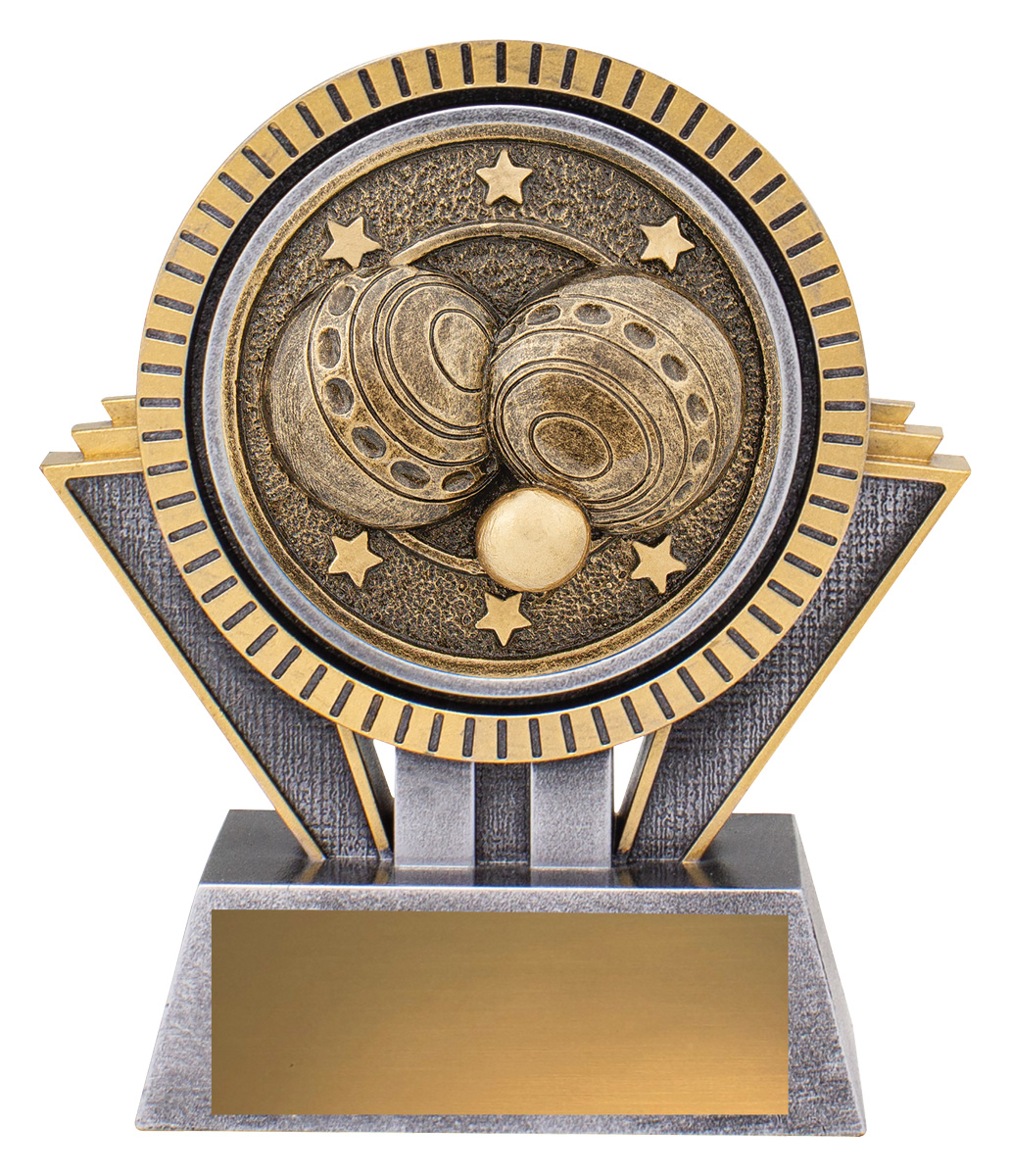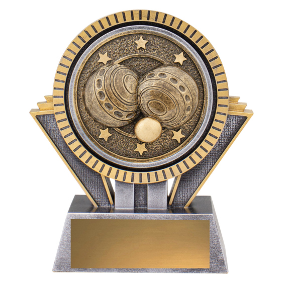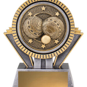 Antique gold resin lawn bowls trophy with detailed bowls emblem and classic shape. Durable and well crafted, this award suits all levels of lawn bowls competition.