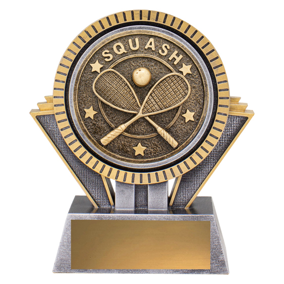This squash trophy displays crossed racquets and ball detailing in antique metallic tones. A stylish option for squash tournaments, club awards, and player recognition.