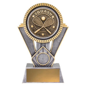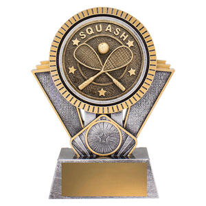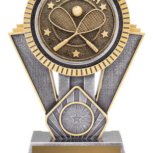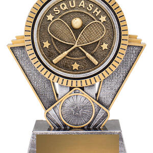 This squash trophy displays crossed racquets and ball detailing in antique metallic tones. A stylish option for squash tournaments, club awards, and player recognition.