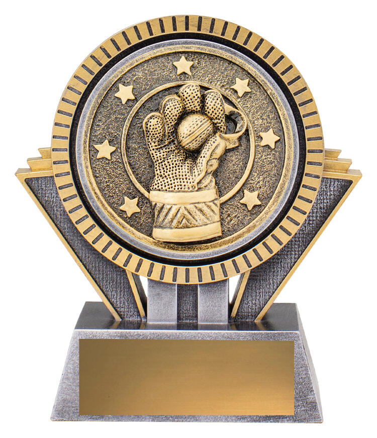 Celebrate cricket achievement with this distinguished trophy, purpose built for wicketkeepers. Available in a silver and gold finish, it features a detailed cricket glove clasping a ball, framed by star motifs on a circular emblem. Crafted from quality resin, this award brings a professional and enduring presence to cricket trophies for clubs, schools, and competitions.