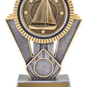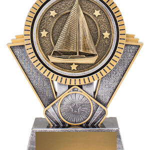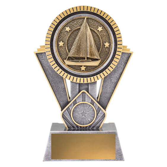 A classic sailing trophy showcasing a detailed yacht in full sail. Finished in antique gold and silver resin, itÂ’s perfect for yachting regattas, sailing clubs, or marine awards. Includes engraving plate.