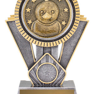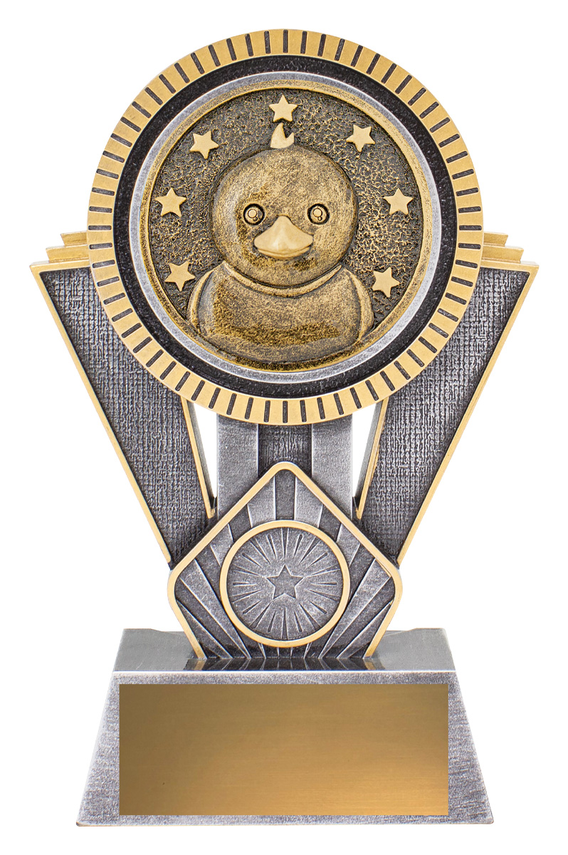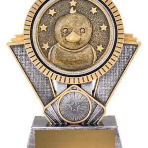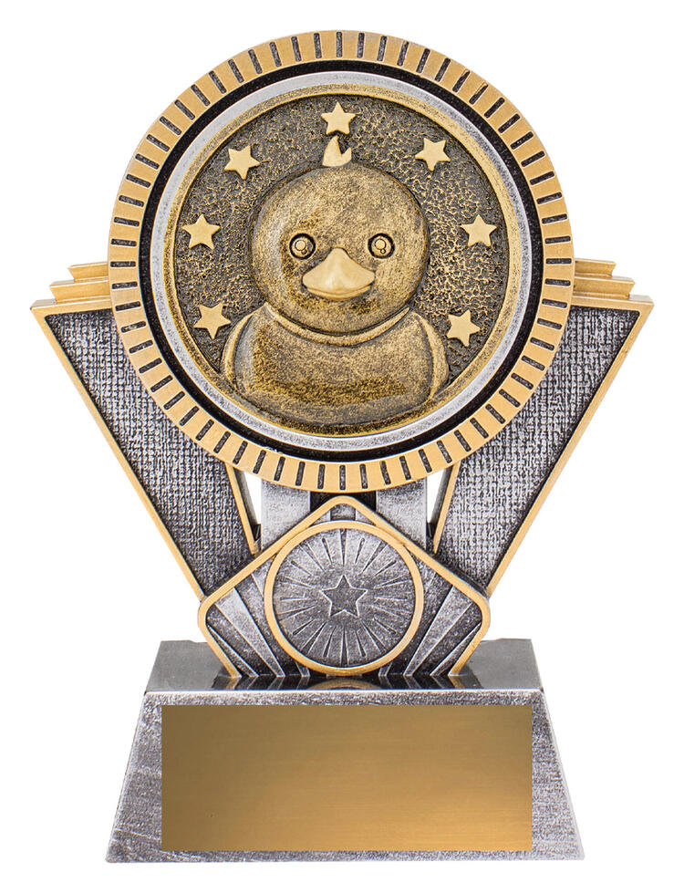 Crafted for moments that deserve a smile, this cricket trophy features a standout duck emblem framed by shining stars. The trophy's elegant gold and silver finishes, paired with a unique combination of circular and angular forms, create a visually engaging piece suitable for club presentations or cricket events. A blank plaque offers the option for custom recognition.