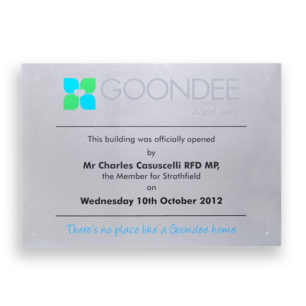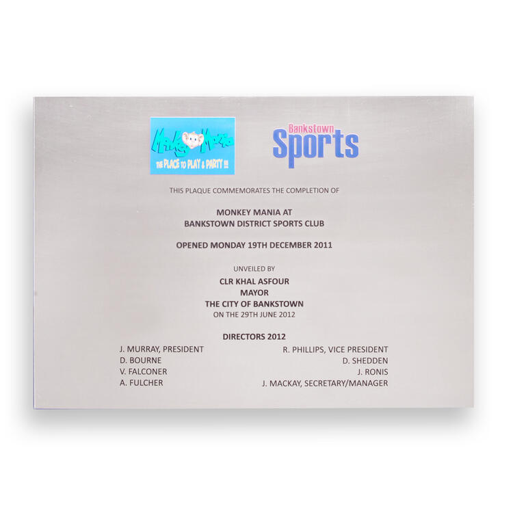 Sublimation printing, best suited for indoor use. Only used on specialised stainless steel with polyester coating. The process involves impregnating the polyester coating with a special sublimation ink transfer by heat pressing. The result is a rich, coloured, and sharp print embedded into the polyester surface. It is ideal for indoor use, including commemorative plaques, memorial plaques, signage and industrial labels.