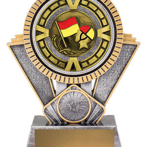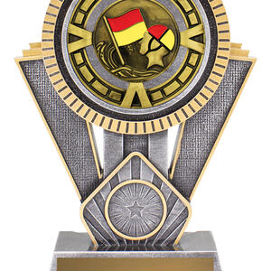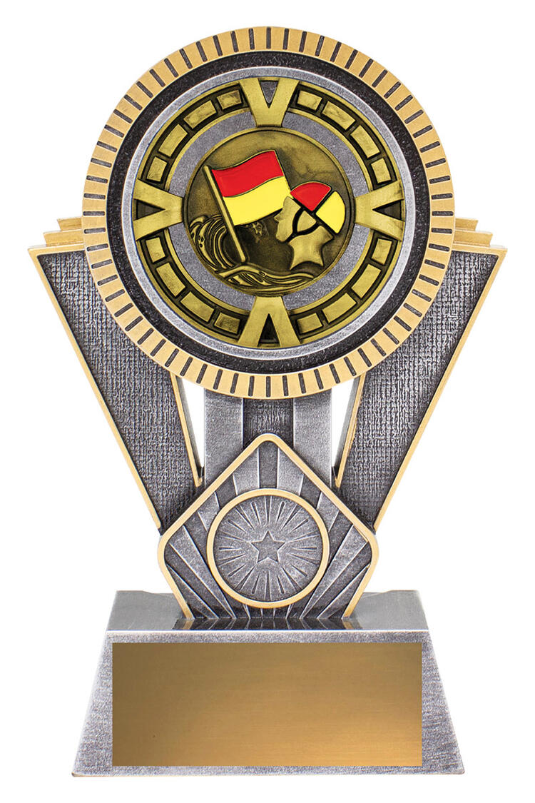 This lifesaving trophy features a dynamic design with a lifesaver holding a red and yellow flag, framed by Roman numerals on a circular emblem. Crafted in gold, silver, red, and yellow, the trophy rests on a sturdy rectangular base, blending durability and elegance. A fitting recognition of commitment, teamwork, and achievement in lifesaving events.