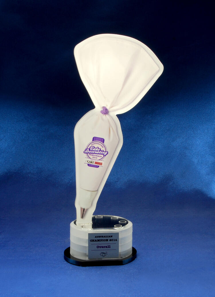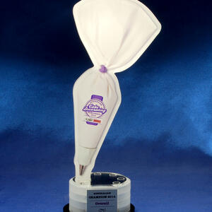 A playful yet premium acrylic award, this design features full colour printed artwork embedded within precision cut acrylic to replicate a piping bag motif. Each piece is mounted on a layered acrylic base with a brushed metal nameplate for professional finish.