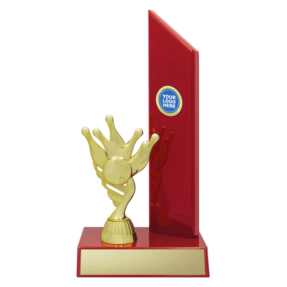 This bold tenpin bowling trophy features a gold bowling pin and ball design, mounted on a glossy red timber base with an angled upright for your logo or sport insert.