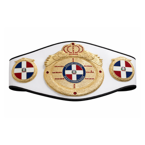 The belt is crafted with a highly detailed gold metal finish mounted on a durable white band with black trim, creating a sharp, high-contrast look with a professional championship aesthetic. Designed as a one-size-fits-all belt, it offers adjustable fastening for comfortable wear and standout presentation.