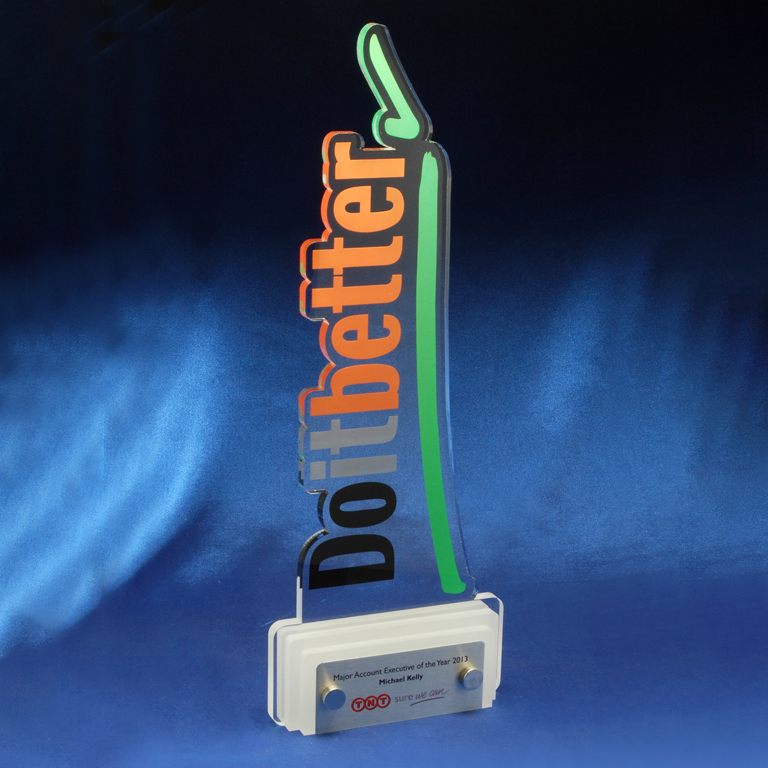 A modern and creative acrylic trophy featuring vibrant full colour print on clear acrylic, cut to shape for bold visual impact. Mounted on a custom multi layer acrylic base with title plate, this piece perfectly combines corporate branding with contemporary design ideal for recognition or performance awards.