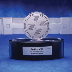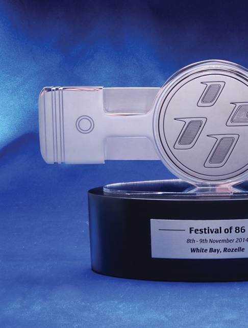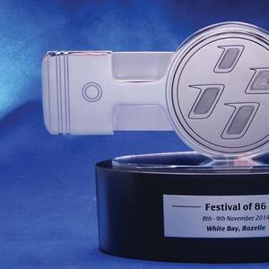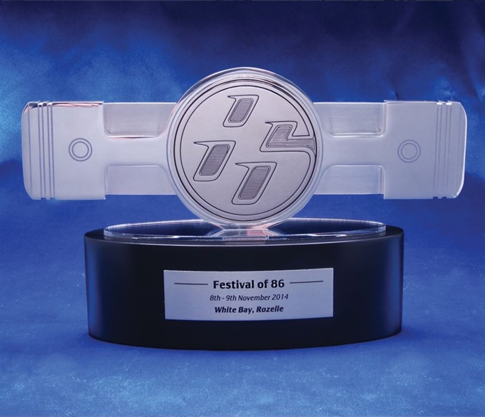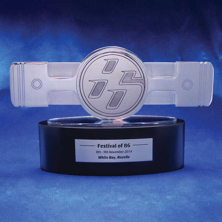 A bespoke brushed alloy trophy featuring a piston inspired design mounted on a black oval base.