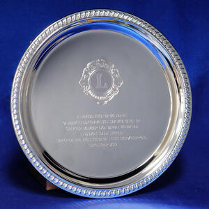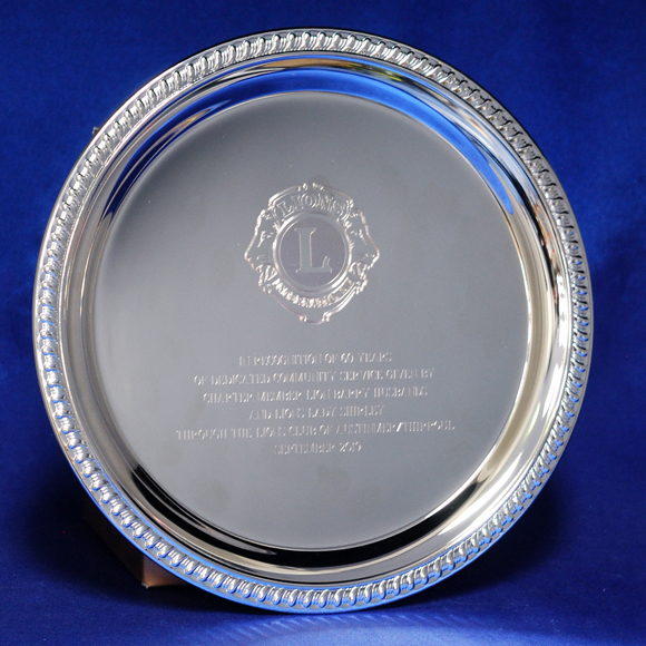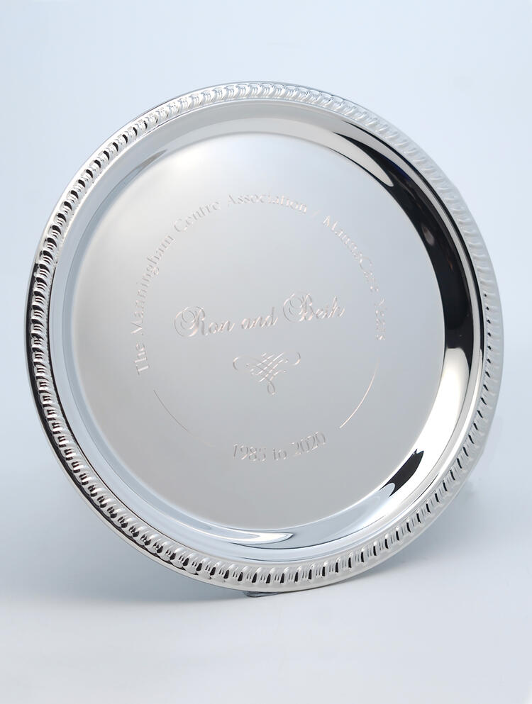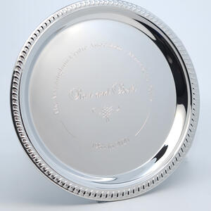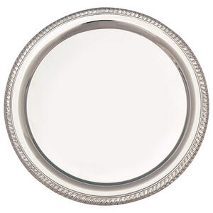 This nickel-plated silver tray is a lightweight, budget-conscious item with a bright, polished finish and decorative edging.