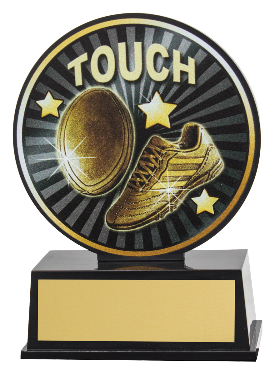 Celebrate sporting achievement with this touch football trophy, designed to honour dedication and skill on the field. Showcasing a golden shoe and ball motif highlighted by stars, it features an elegant gold and black finish and a modern oval silhouette with a sturdy rectangular base. Quality plastic materials and precise detailing make it a memorable choice for recognising touch football excellence.