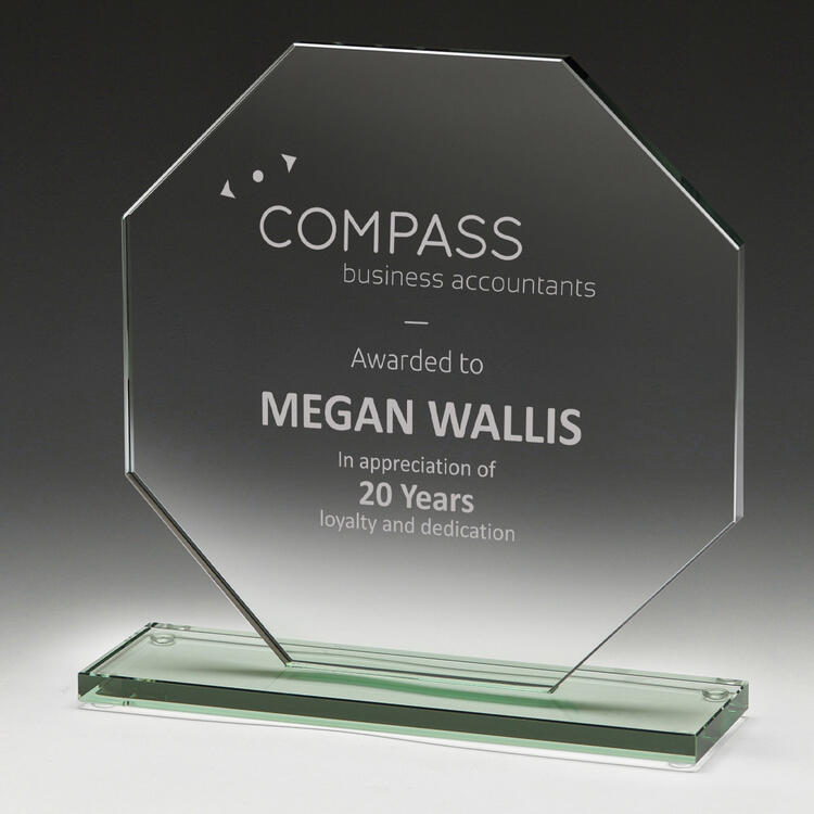 Glass trophies typically have a very slight green tinge, which can subtly affect the appearance of colour printing. In contrast, crystal trophies are completely clear.