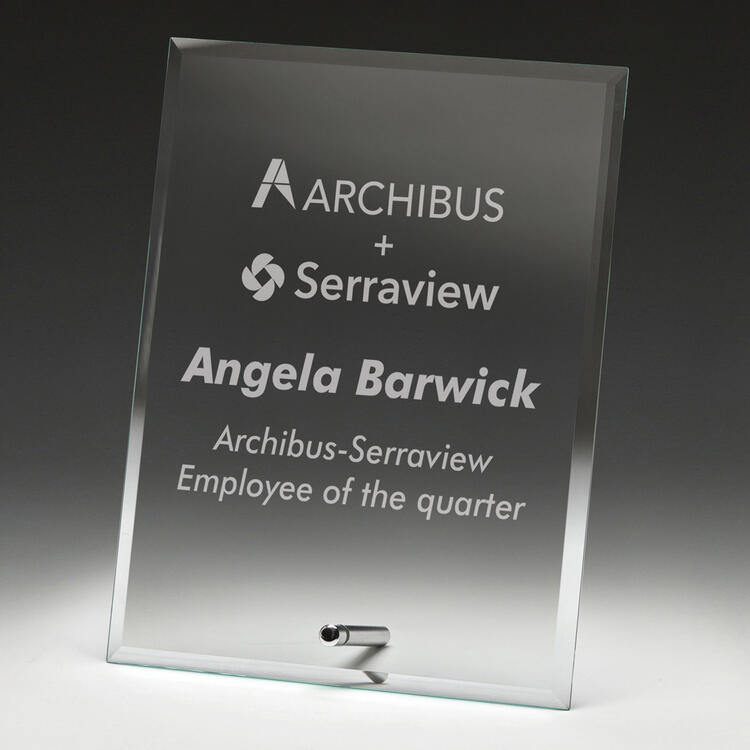 This glass plaque brings together clear glass and silver metal in a refined, rectangular form that stands freely for versatile display. The combination of materials delivers a polished aesthetic suited to professional recognition and celebration of achievement. With a minimalist design and quality finish, this glass plaque is an elegant choice for commemorating milestones and outstanding contributions.