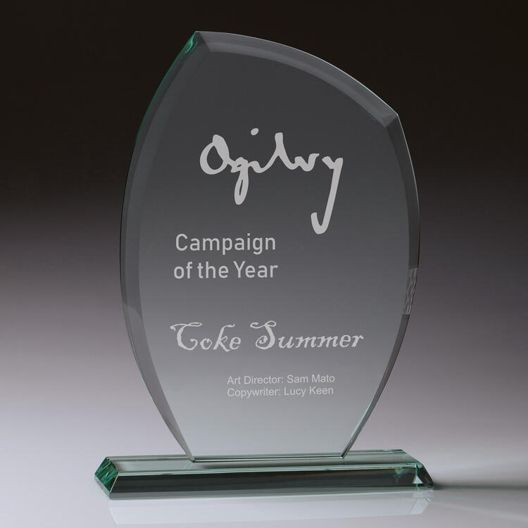 Glass trophies typically have a very slight green tinge, which can subtly affect the appearance of colour printing. In contrast, crystal trophies are completely clear.