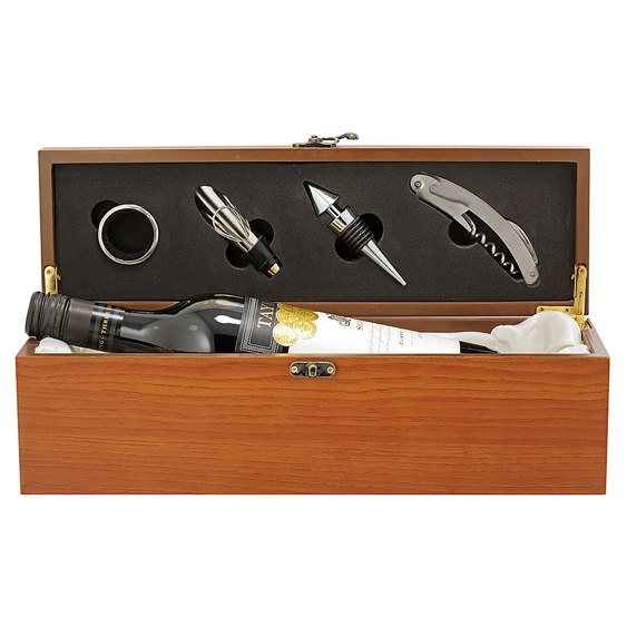 Crafted for occasions that call for distinction, this wine gift box combines refined materials and thoughtful presentation. The rectangular design in Cherry finished timber, black, and silver houses your bottle of wine bottle alongside essential accessories like a corkscrew and wine stopper. Durable wood, sleek metal, and clear glass come together to create a memorable, practical piece for professional or celebratory gifting.