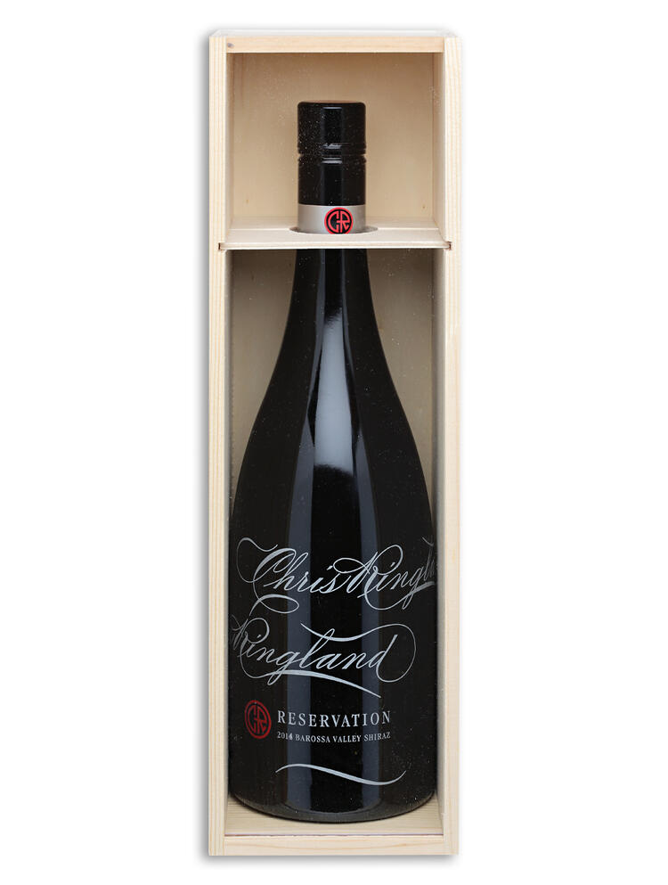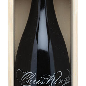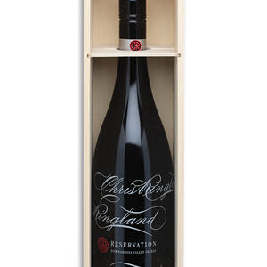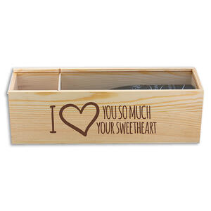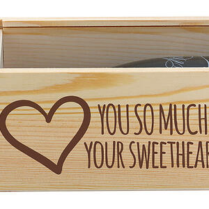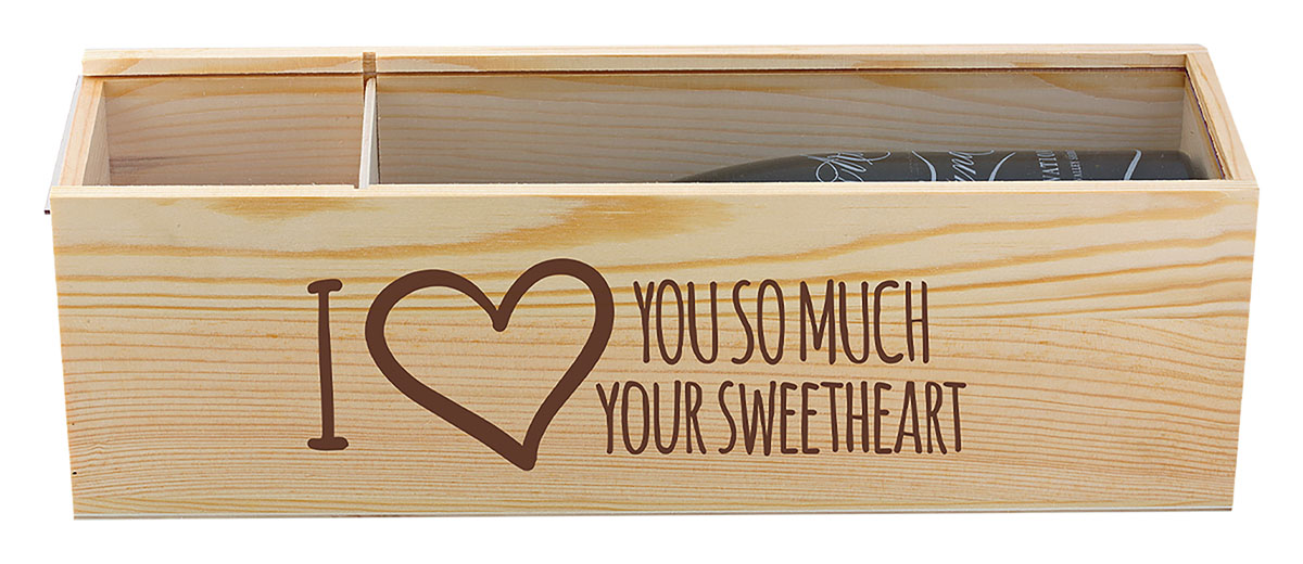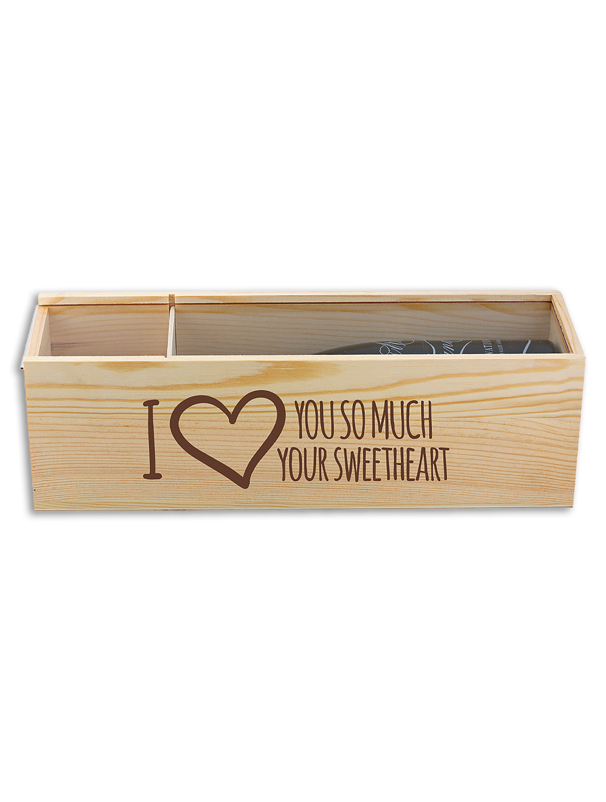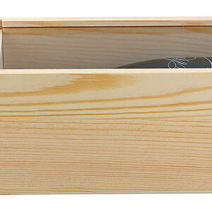 This wine gift box combines refined natural wood with a modern black finish, offering a distinguished way to present a bottle of wine. The rectangular box features a sliding lid and a transparent top panel, showcasing the cylindrical glass bottle inside. An optional engraved message on one side adds a thoughtful, personal touch to this elegant and memorable giftware solution.