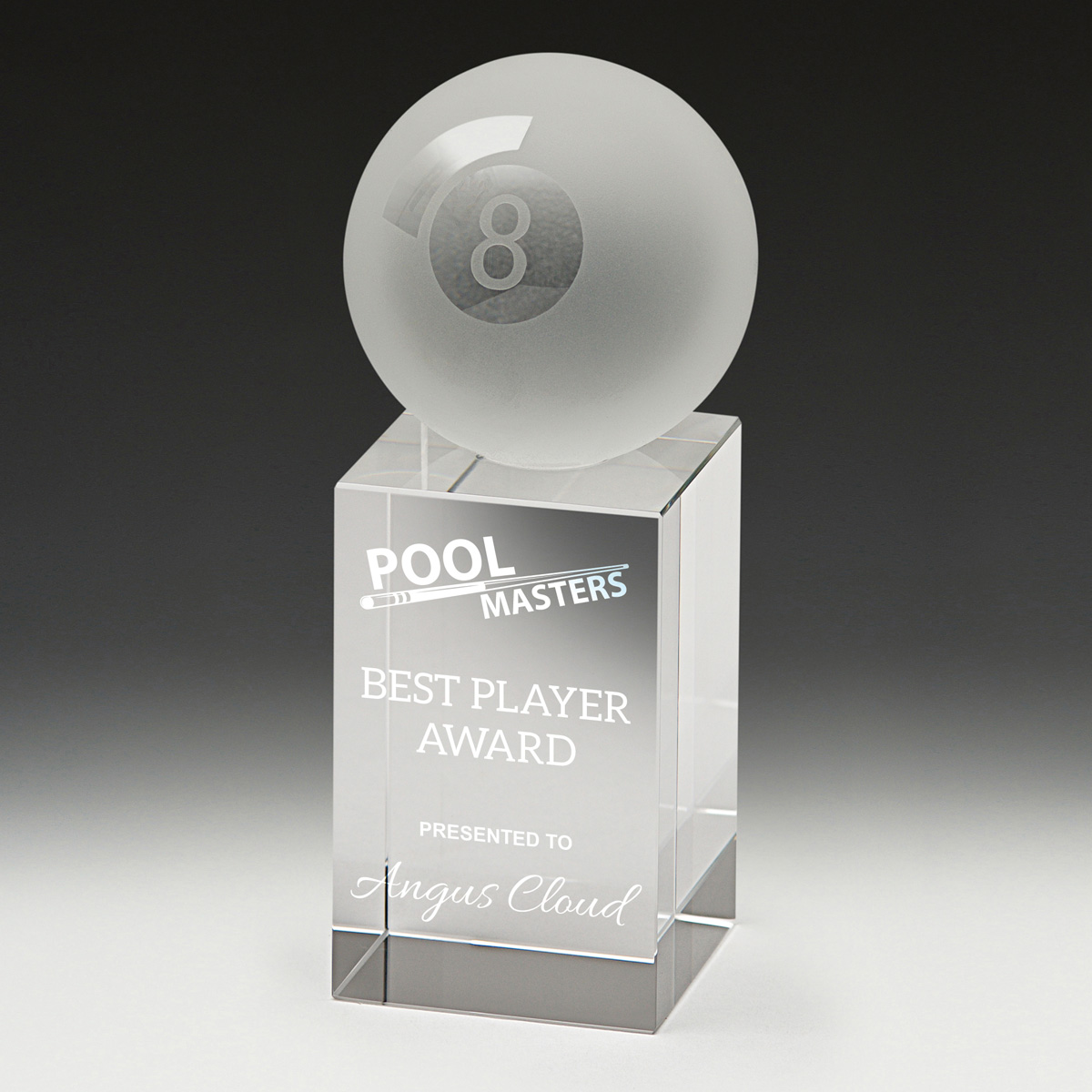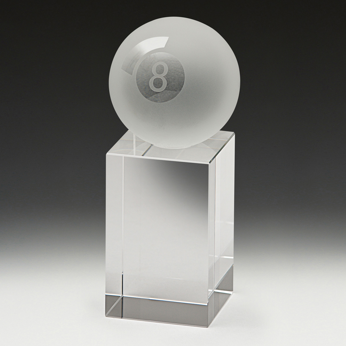Crafted from clear and frosted crystal, this snooker trophy is distinguished by its rectangular base and a striking spherical top. The sphere features an engraved '8', symbolising precision and achievement in pool. An elegant choice for recognising dedicated players, its durable material and refined design make it a memorable addition to any awards presentation.